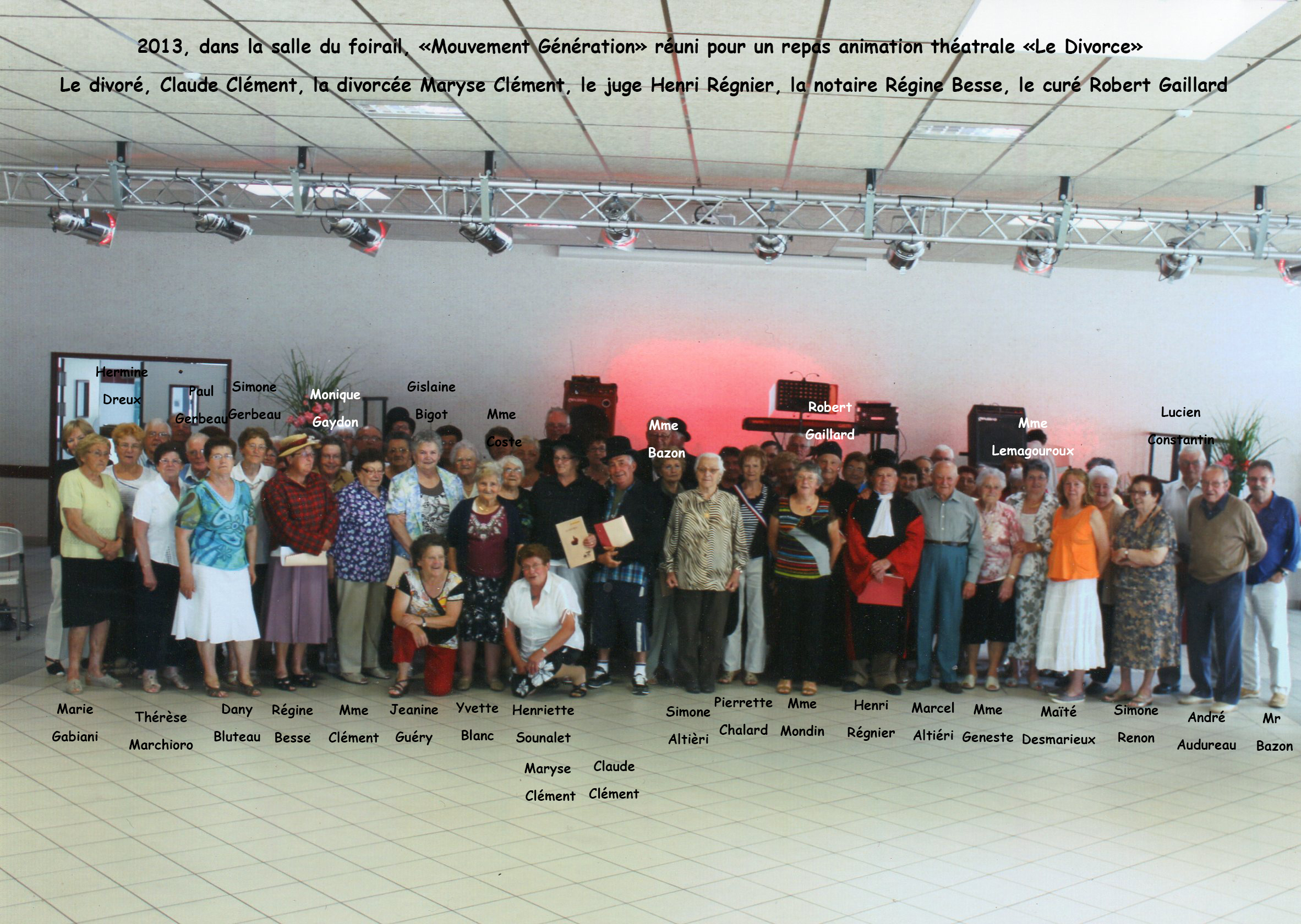 LES PASSEURS DE MÉMOIRE DU PAYS DE DURAS: 2013, dans la salle du foirail, «Mouvement Génération» réuni pour un repas animation théâtrale «Le Divorce»